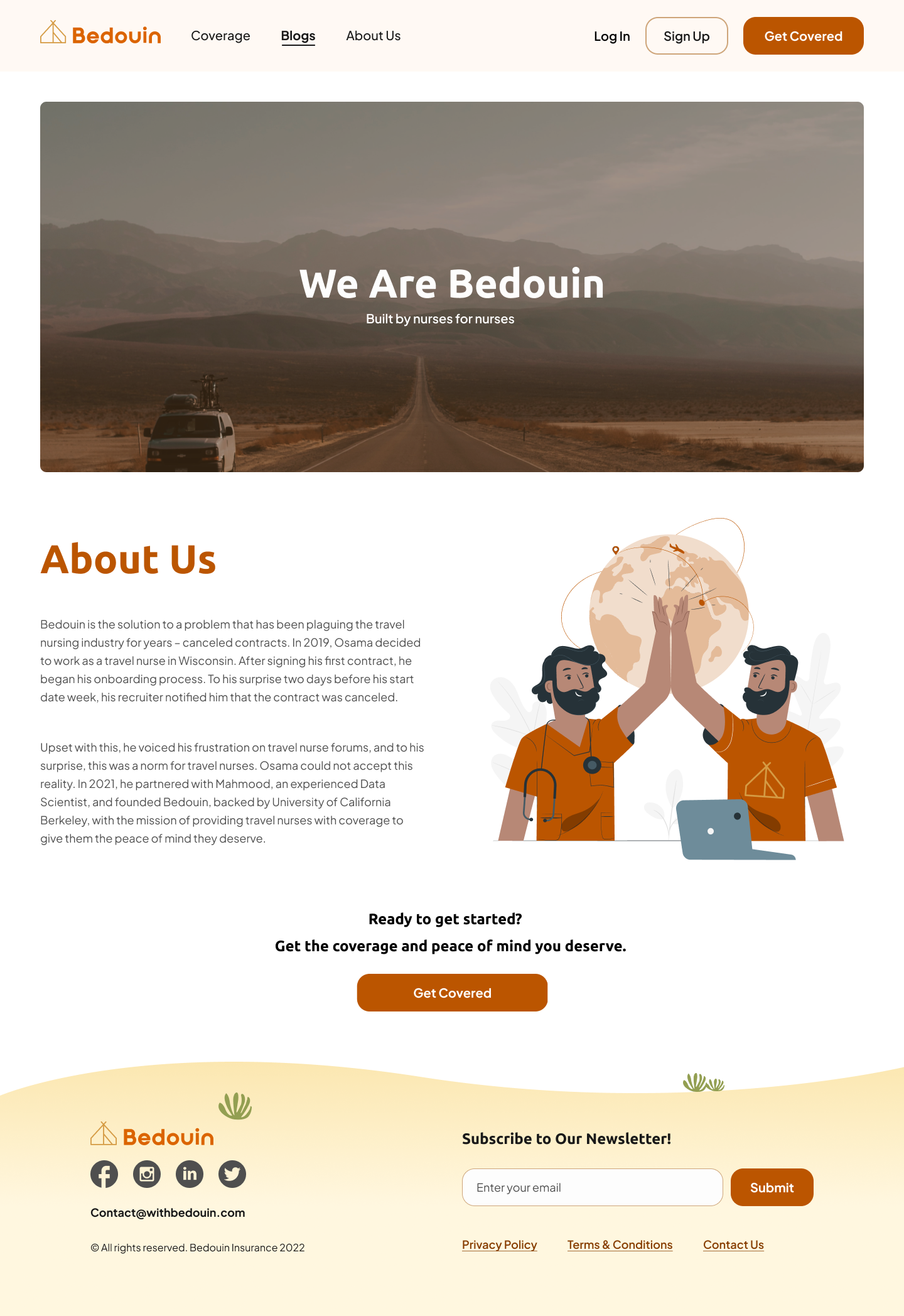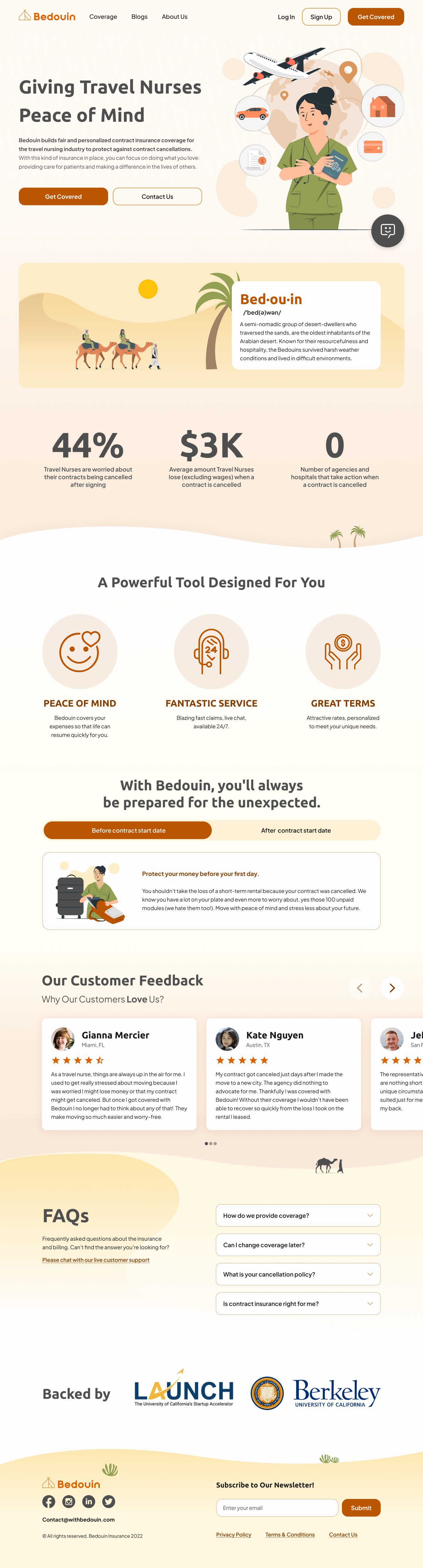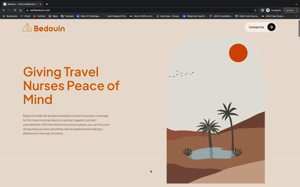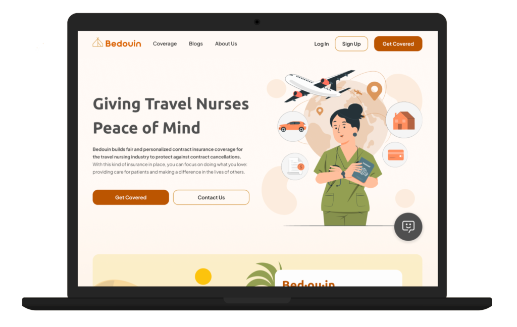Bedouin is B2C web application that builds fair and personalized contract insurance coverage for the travel nursing industry to protect against contract cancellations.