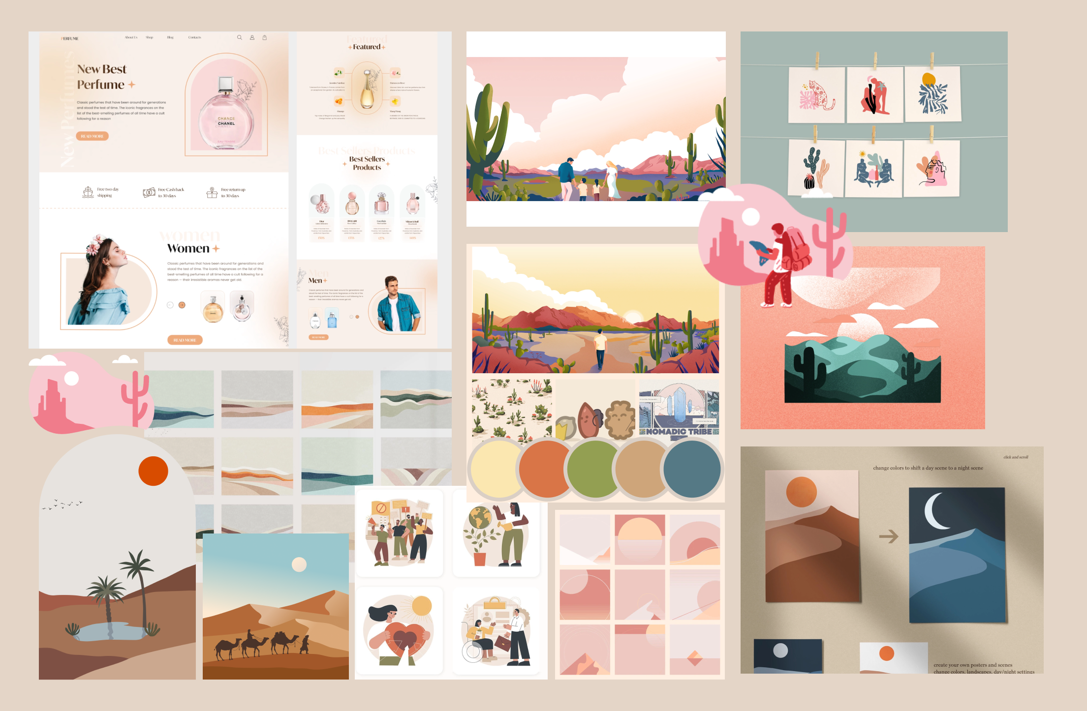I created a mood board to help illustrate the overall vibe of the website. The UI should be maintaining a visual style that reflects brand personality and theme; semi-nomadic and Sahara Desert.